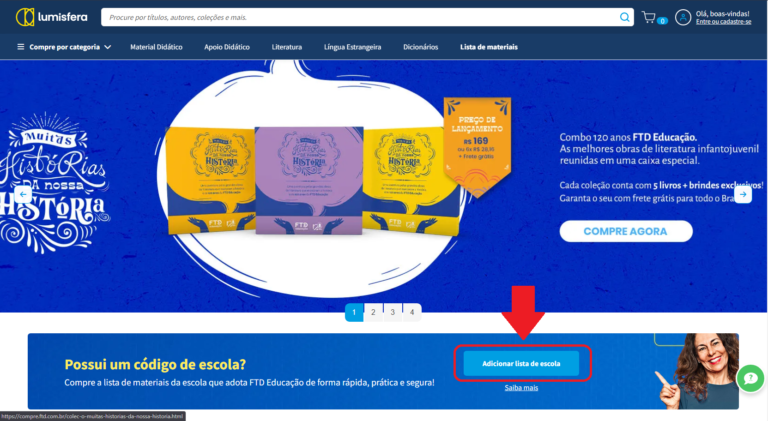Acesse o site https://compre.ftd.com.br/ e clique no botão “Adicionar lista de escola” destacado na imagem acima.