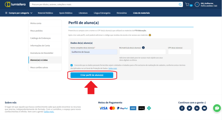 Preencha o campo “Nome Completo do Aluno”, concorde com os termos e clique no botão “Criar perfil de aluno(a)”.