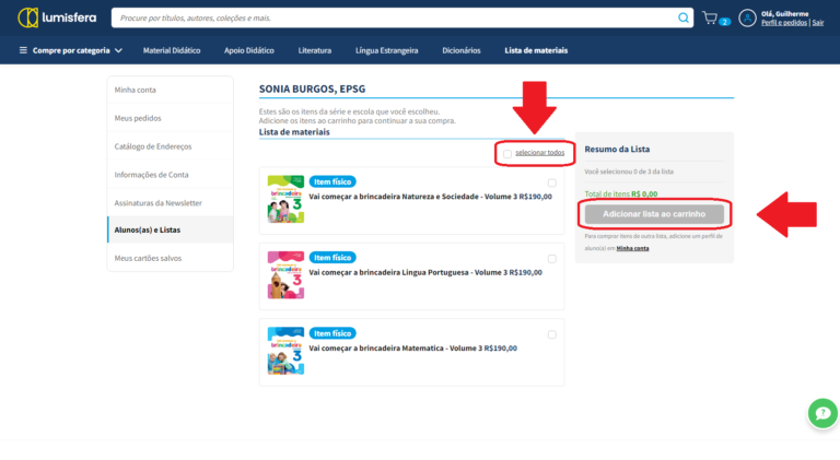Selecione os materiais, adicione ao carrinho clicando no botão “Adicionar lista ao carrinho”. Logo após, finalize sua compra.