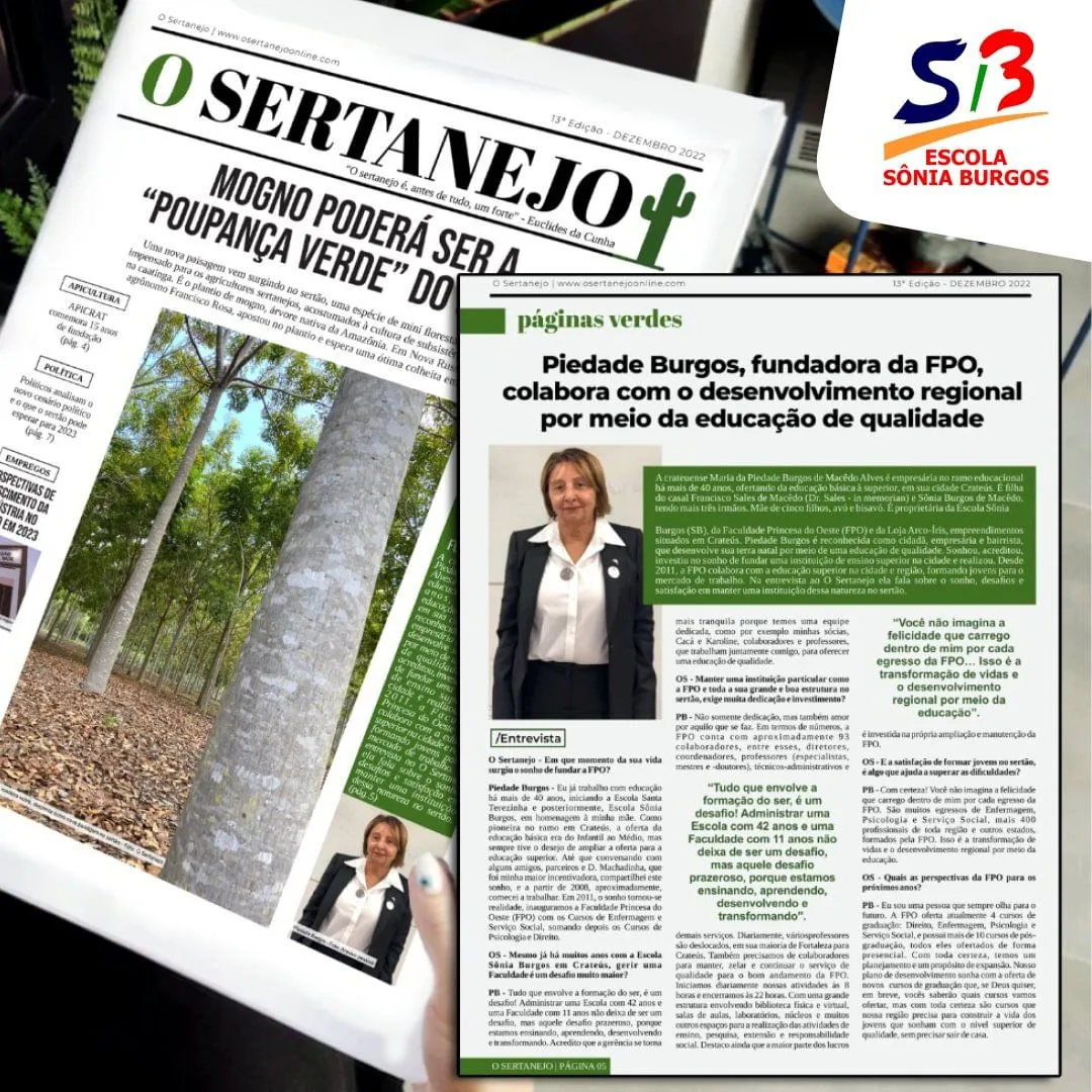 A Diretora Geral da Faculdade Princesa do Oeste (FPO) e mantenedora da Escola Sônia Burgos, Maria da Piedade Burgos, foi destaque no Jornal O Sertanejo, no mês de dezembro de 2022 – 13ª Edição.